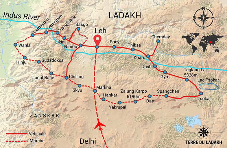Cet itinéraire vous permettra de voir le Ladakh sous toutes ses facettes : courte randonnée sous tente, rencontre avec les locaux