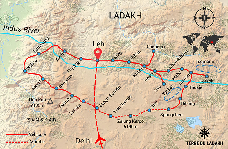 Le Ladakh, la « terre des hauts sommets », regorge de cols, ce n’est un secret pour personne. Toutefois, certains cols, certains passages dans les montagnes restent très peu explorés ou empruntés, parfois oubliés. Ce trek de la Terre du Milieu vous propose de passer par l’un de ces sentiers très peu fréquenté, connu uniquement des gens de la région, qui n’hésitent pas à colporter nombre d’histoires à son propos… En vérité, c’est une route qui depuis longtemps reliait la vallée de Changthang au Zanskar, et était utilisée principalement par les éléveurs de Dzo, ces larges animaux utilisé pour labourer les champs (croisement entre le yak et la vache). Et son intérêt majeur est de pouvoir rejoindre la vallée du Zanskar par une autre route, moins encombrée que la grande traversée. Vous arpenterez quelques-uns des plus beaux cols du Ladakh, comme le Zalung Karpo, avant de déboucher sur la grande vallée, par le côté est, ce qui vous permettra de découvrir quelques villages clés de la grande vallée comme Pishu ou Pidmo, situés juste avant Padum. Un circuit magnifique et très peu utilisé, qui ravira les amateurs de trek au long cours.