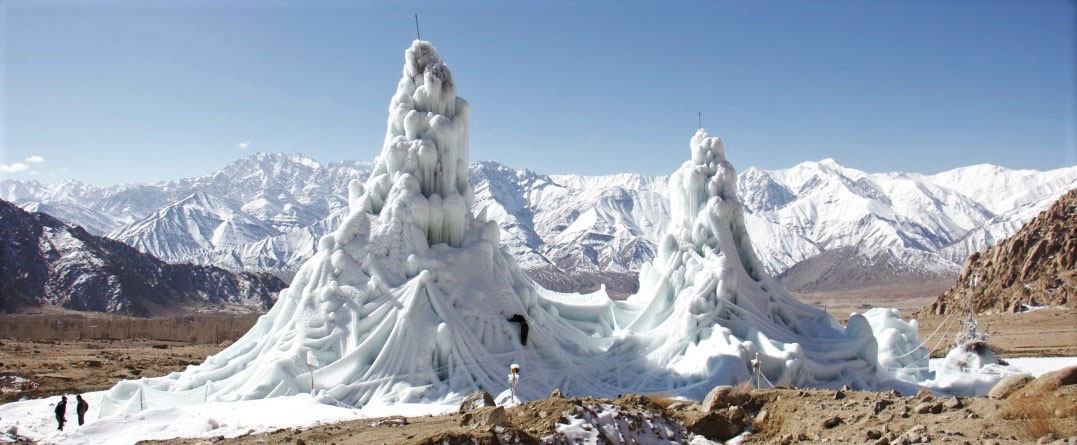 Le premier Ice Stupa a été inauguré au Ladakh en 2015, et a permis le stockage de deux millions de litres d’eau, qui ont permis d’arroser des plantations de peupliers ! Sonam Wangchuk s’est vu attribuer grâce à ce projet le prix Rolex 2016.